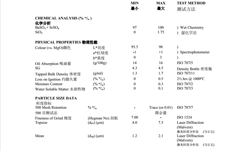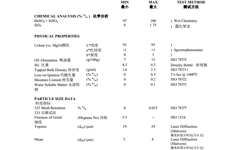 硫酸鋇粉又稱重晶石粉,化學(xué)組成為BaSO4,晶體屬正交(斜方)晶系的硫酸鹽礦物。常呈厚板狀或柱狀晶體,多為致密塊狀或板狀、粒狀集合體。質(zhì)純時(shí)無色透明,含雜質(zhì)時(shí)被染成各種顏色,條痕白色,玻璃光澤,透明至半透明。具3個(gè)方向的完全和中等解理,莫氏硬度3~3.5,比重4.5。