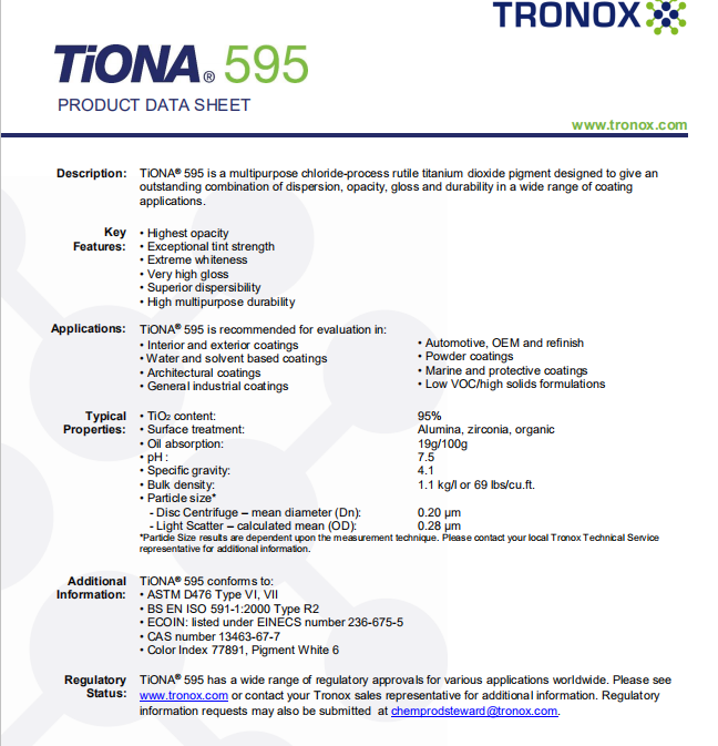 澳洲Cristal的鈦白粉Tiona595、Tiona696 應(yīng)用于粉末涂料中,是一種多功能產(chǎn)品,具有易于分散,出色的不透明性和光澤以及高耐久性的出色組合。