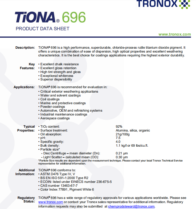 澳洲Cristal的鈦白粉Tiona595、Tiona696 應(yīng)用于粉末涂料中,是一種多功能產(chǎn)品,具有易于分散,出色的不透明性和光澤以及高耐久性的出色組合。